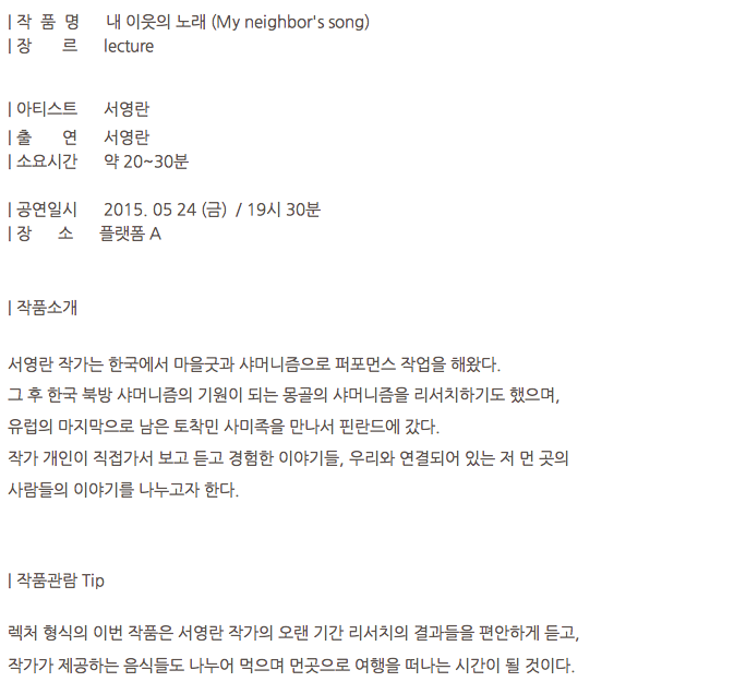 My Neighbor’s Song_Finland My Neighbor’s Song 내 이웃의 노래 (Lecture, 40min) Credit Artist/ Yeong Ran Suh Support/ Platfrom A, Joo Hyun Kim, Bora Kim