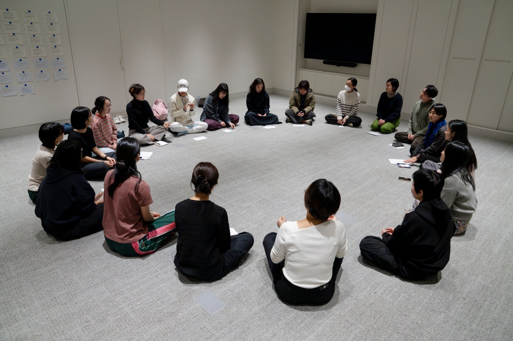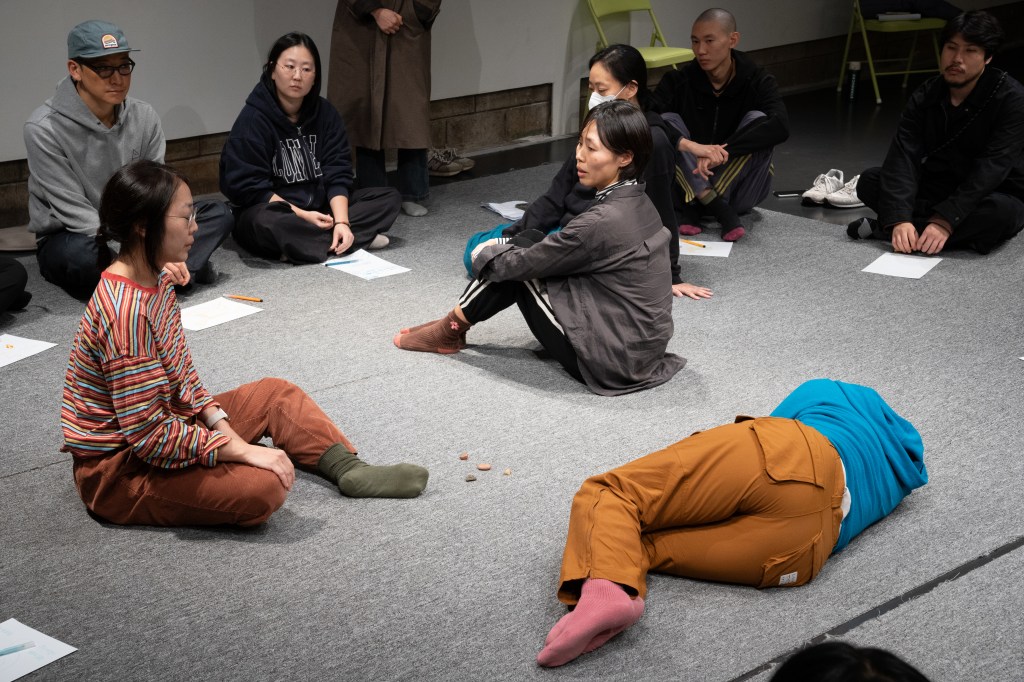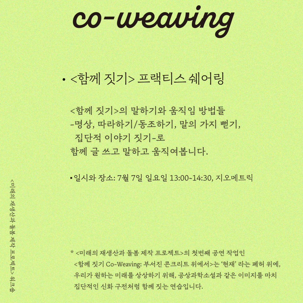 In this workshop, we write, talk, and move together using the choreographic methods of the <Co-Weaving> performance – meditation, imitating/synchronizing, extending the branches of words & sentences, and building a collective story.