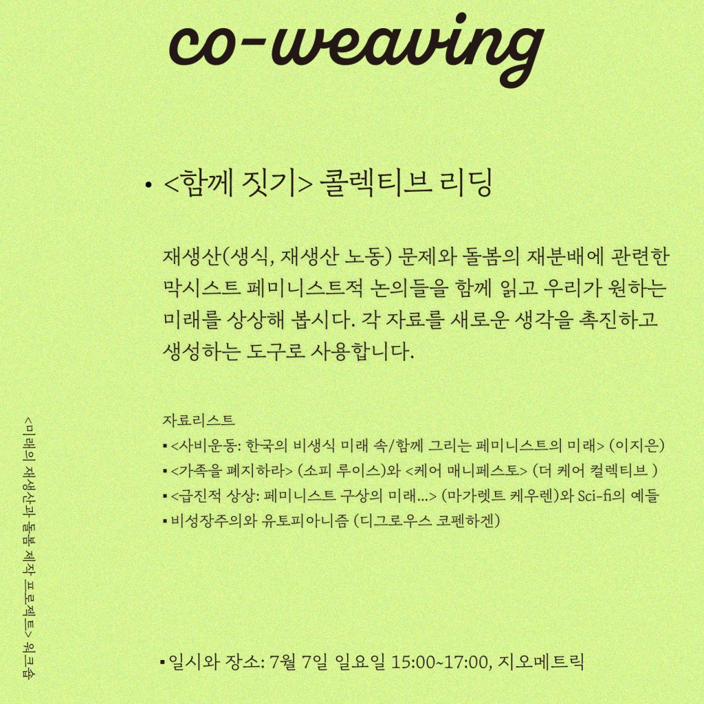 In this workshop, we read the Marxist-feminist discussions related to reproduction (reproductive labor) issues and redistribution of care. Inspired by the feminist sci-fi writers, we will try to imagine our desirable future. Reading materials will be used as a tool to stimulate and generate our new ideas.