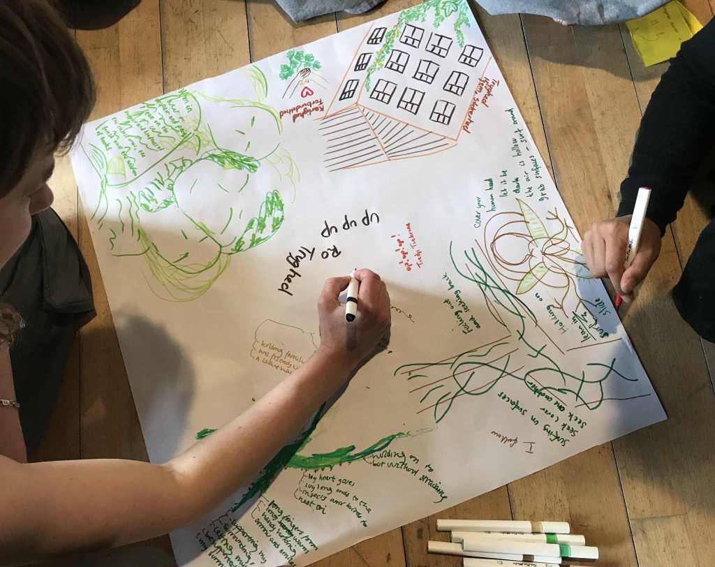 We reflect Ivy’s feature, interdependence, within us. We reach, follow, imitate, and connect each other’s different images recalled by Ivy and weave them into a shared landscape to create visions for our prosperity by playing with a choreographic score: ‘storytelling meditation’, ‘imitating and transforming words and movements’, ‘Ivy group dance’, and ‘group echoing’.