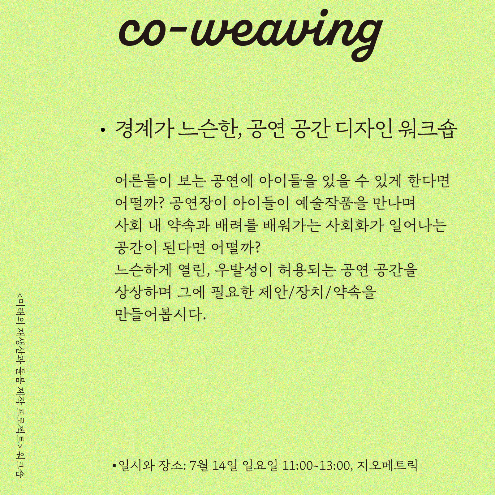 What if we could allow children to be present at a performance targeted for adults? What if the performance space becomes a space for socialization where children not only encounter art pieces but also learn about social promises and consideration within our society? In this workshop, we discuss and imagine a loosely open, contingency-allowed performance space and create the necessary proposals/devices/promises for that.
