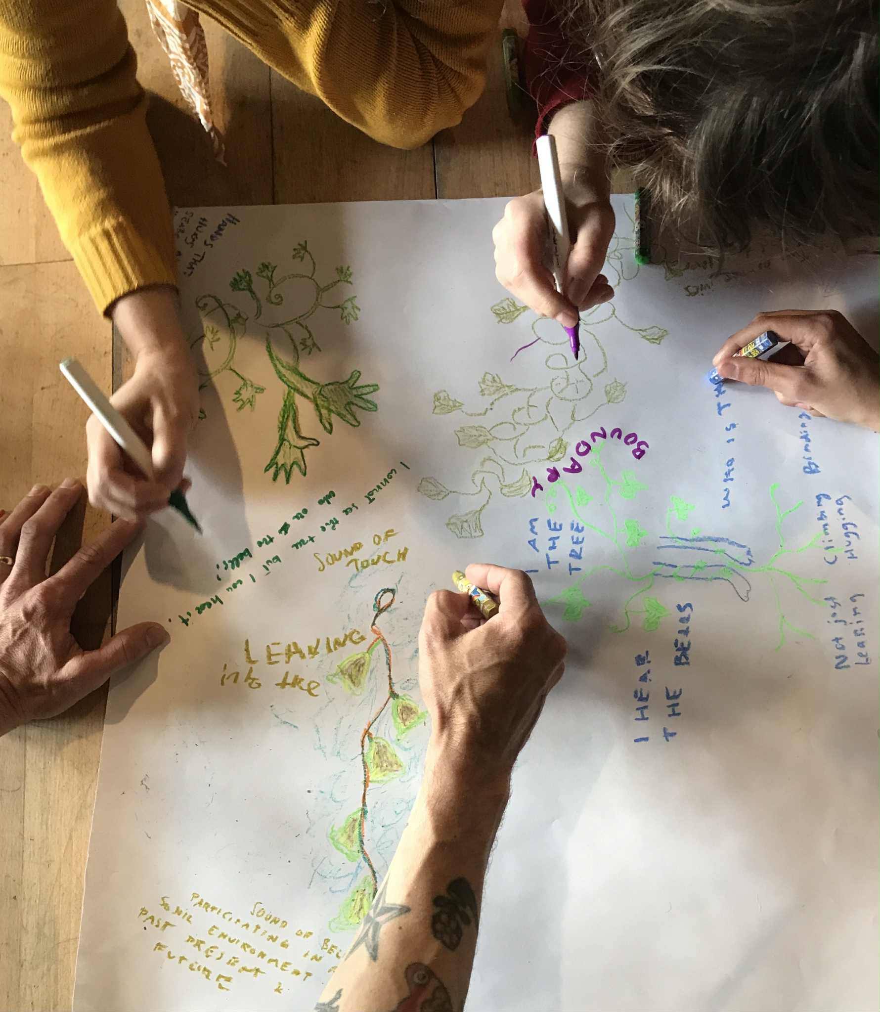 We reflect Ivy’s feature, interdependence, within us. We reach, follow, imitate, and connect each other’s different images recalled by Ivy and weave them into a shared landscape to create visions for our prosperity by playing with a choreographic score: ‘storytelling meditation’, ‘imitating and transforming words and movements’, ‘Ivy group dance’, and ‘group echoing’.
