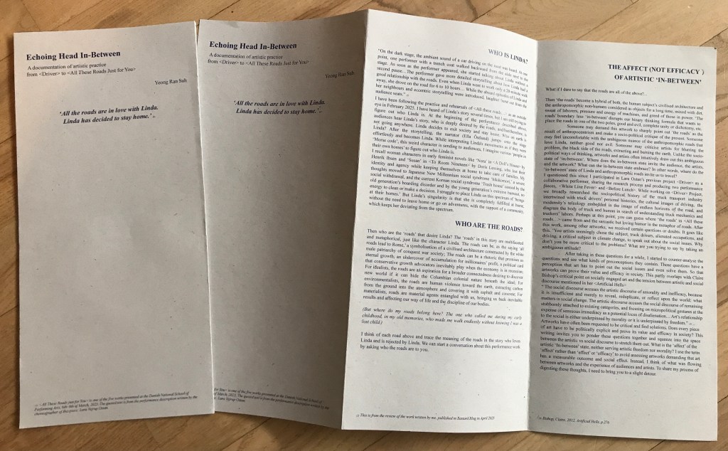 1. <All These Roads just for You> is one of the five works presented at the Danish National School of Performing Arts, 6th~9th of March, 2025. The quoted text is from the performance description written by the choreographer of this piece, Lara Vejrup Ostan.