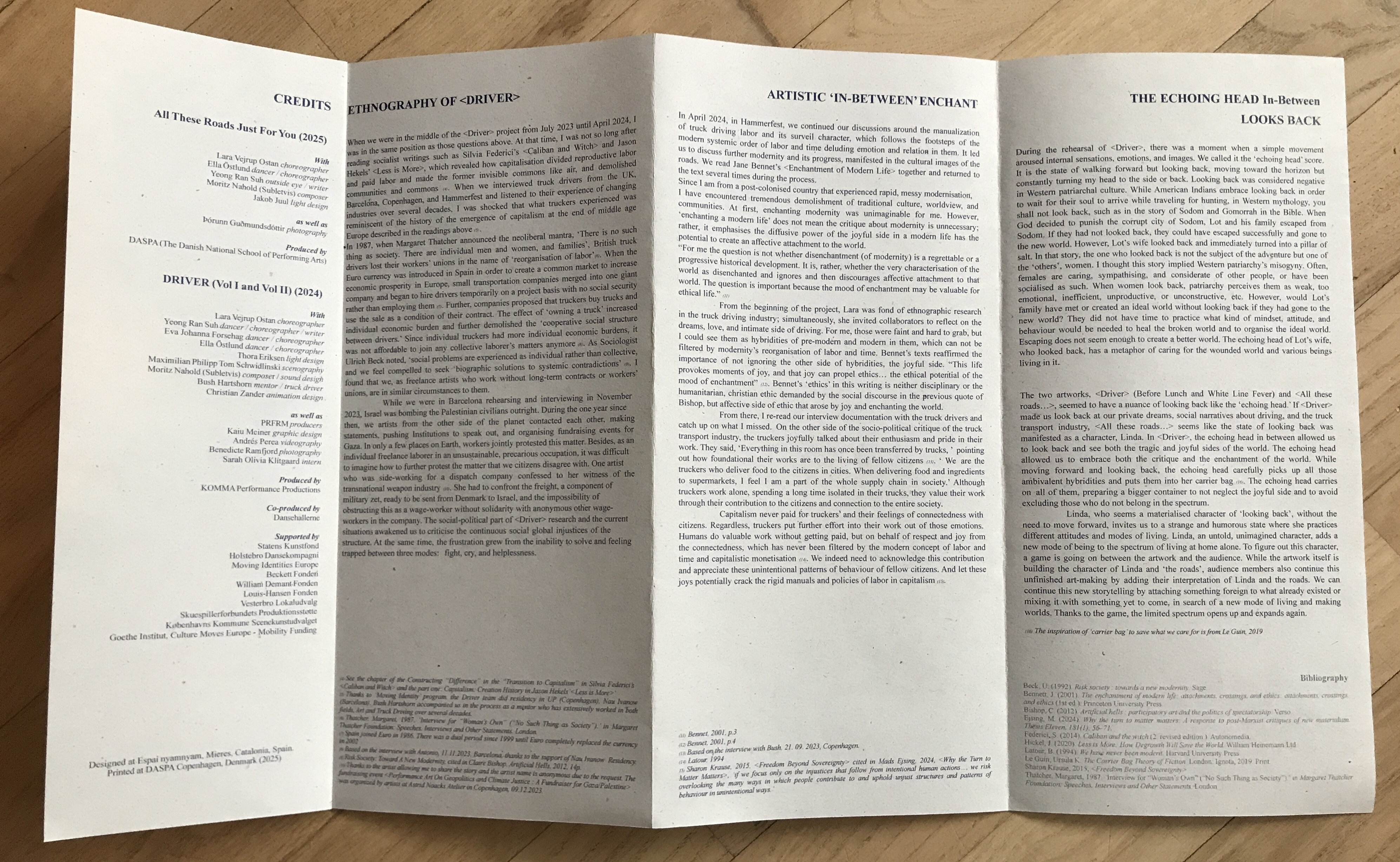 1. <All These Roads just for You> is one of the five works presented at the Danish National School of Performing Arts, 6th~9th of March, 2025. The quoted text is from the performance description written by the choreographer of this piece, Lara Vejrup Ostan.