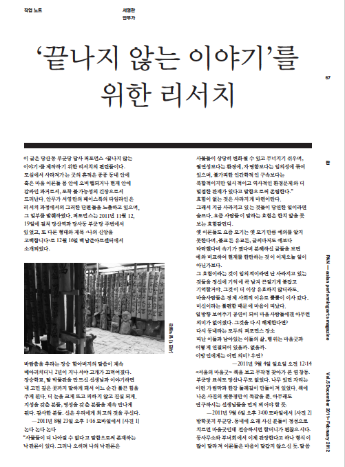 This performance invites audiences to Dangsandong village, where you will meet and visit villagers at a local restaurant, office, house, and shamanic shrine. You will be told the stories of Dangsandong shamanic ritual, which is still alive in the city with traces of history and civilization.
