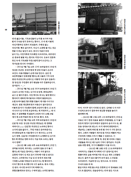 In 2011, I conducted an ethnography on Seoul village shamanism, visiting villages following the previous folklore studies, ‘Seoul Maeul Gut (Hong Ju Park, 2001)’. I visited each site of the shrine, including the sacred tree, and contacted the chief of the ritual, as well as district centers and community centers. I also interviewed elderly people who maintain and participate in village shamanic rituals.